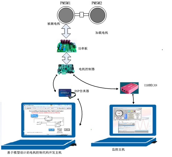 基于模型设计的电机控制器系统结构如图 所示,在代码开发主机上开发基于MATLAB/SIMULINK的永磁同步电机控制算法,在监控主机上发送控制指令、接收电机状态。电机控制器采集电机状态后更新输出指令,控制功率板IPM模块上IGBT的开关状态,形成对永磁同步电机的闭环控制。加载电机模拟负载特性,有现成产品级伺服电机控制器实现对加载电机的控制。